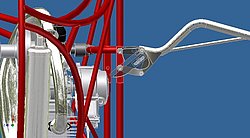 While starting and landing the push brace are low, so the center has moved before the main balance point, and the engine tips with pleasure down and supports starts and landings. When flying, the push brace is horizontal and the fulcrum lies very near the center of the engine and it does not press the pilots back and vibrations are kept off almost completely. The left push rod has a special design which compensate efficient the negative torque effect from this strong and powerful engine. This all sound very technically, but the main point is: the engine and pilot becomes one. No more torquing away while starting or leaned back landings, where the equipment shatters into 1000 pieces.